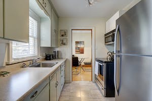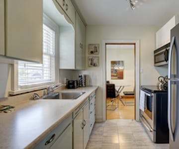 This bright and airy suite is located on the second floor and overlooks a tree-lined street. It has windows on 3 sides for cross breezes, and is air conditioned for those sticky days. Access is from our private off-street parking via the backyard, so it’s always safe and secure.